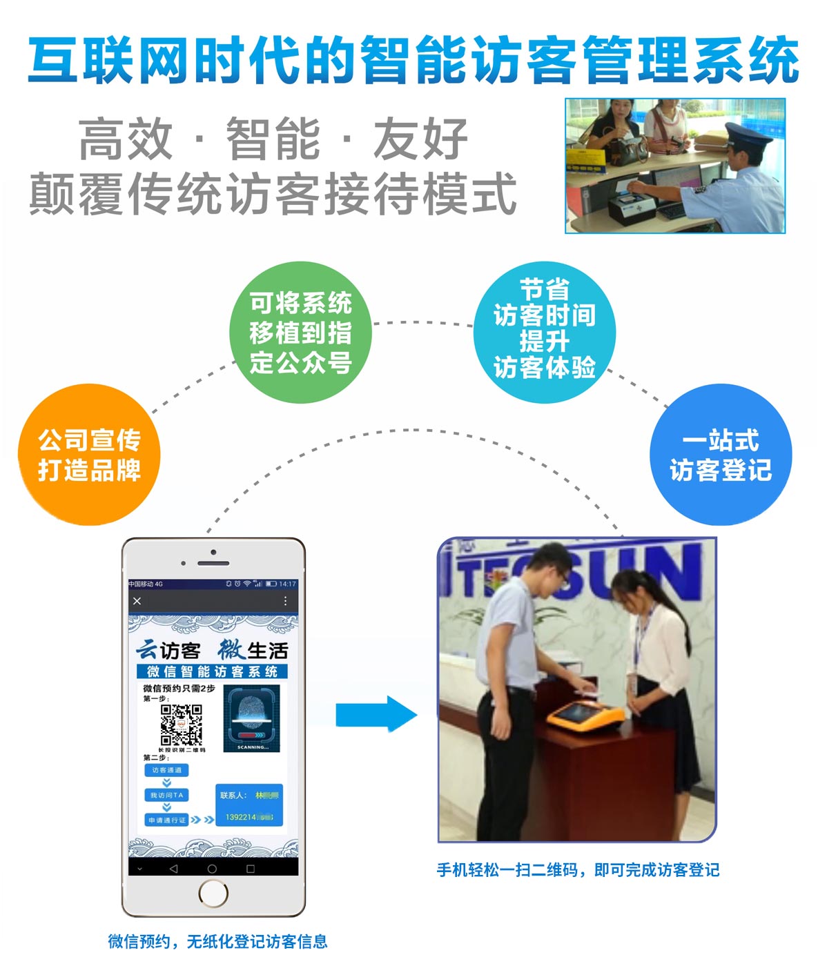 微信預約對接門禁道閘版訪客系統以微信公眾號為依托,對接門禁系統,實現訪前預約、掃碼登記、掃碼開啟道閘門禁等功能,為訪客提供自助來訪登記的訪客體驗,解決了訪客排隊等候登記身份信息的困擾,也節省了制作門禁卡的成本。